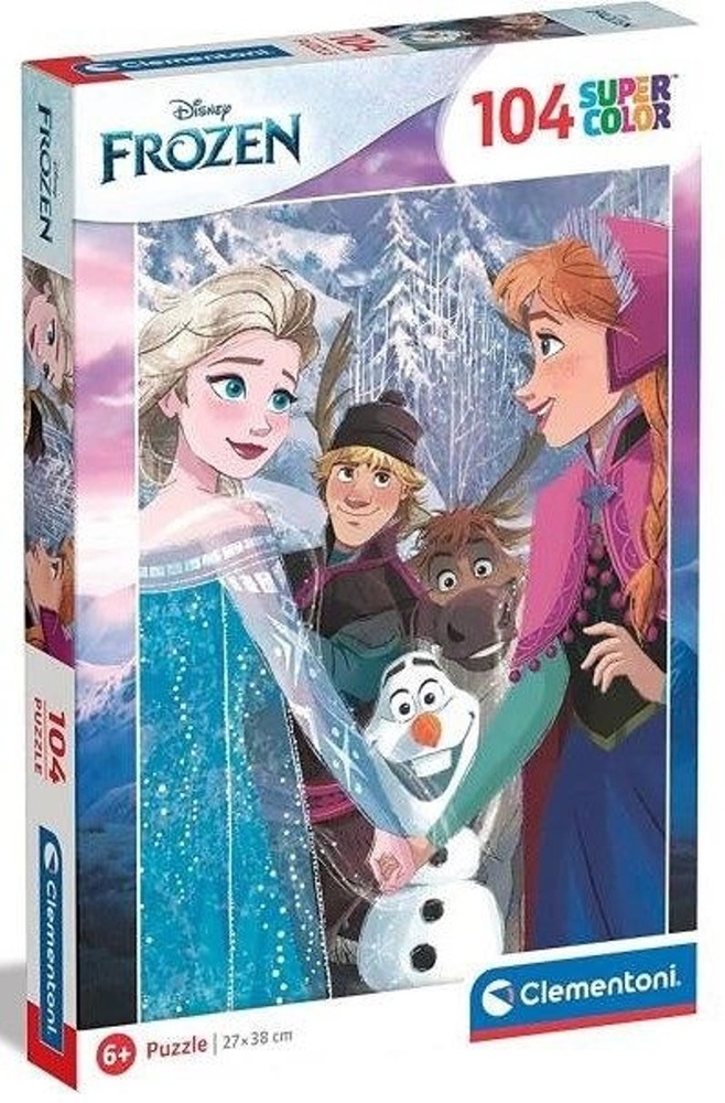 Barevné puzzle s motivem oblíbené pohádky Frozen. Balení obsahuje 104 dílků. Rozměry po složení: 27 × 38 cm.