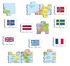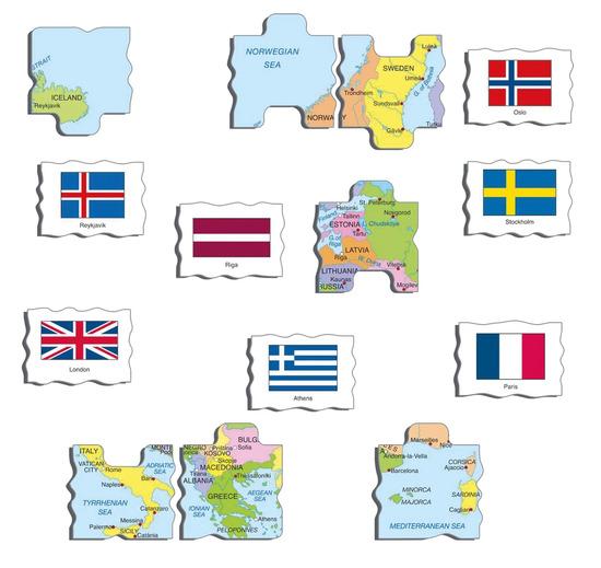 Deskové vzdělávací puzzle zobrazuje evropské státy a jejich vlajky. Věk: 4+