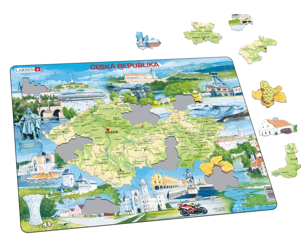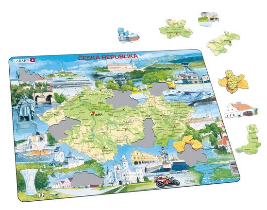 Deskové vzdělávací puzzle zobrazuje mapu České republika a různá zajímavá místa ze všech krajů. Věk: 4+