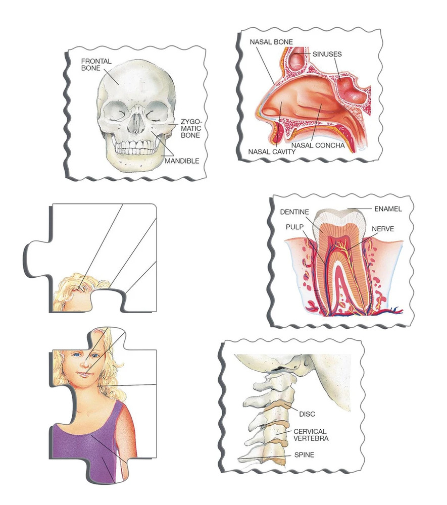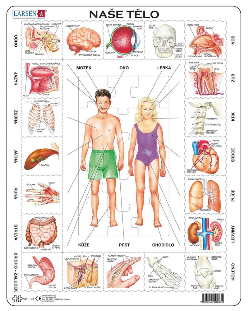 Deskové vzdělávací puzzle seznamuje jednoduchou formou s lidským tělem a jeho jednotlivými částmi.