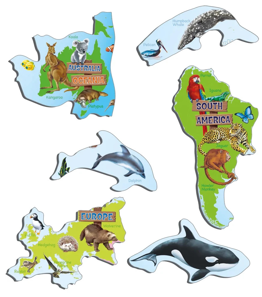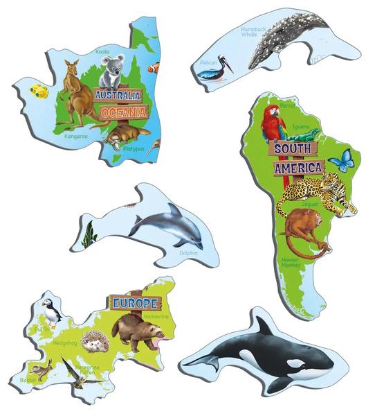 Deskové vzdělávací puzzle zobrazuje jednotlivé kontinenty a pro ně typické zástupce zvířecí říše.
