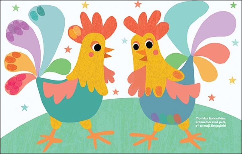 Razítkování prstíky obsahuje 32 stránek plných veselých obrázků k dorazítkování a 6 prstových barev.