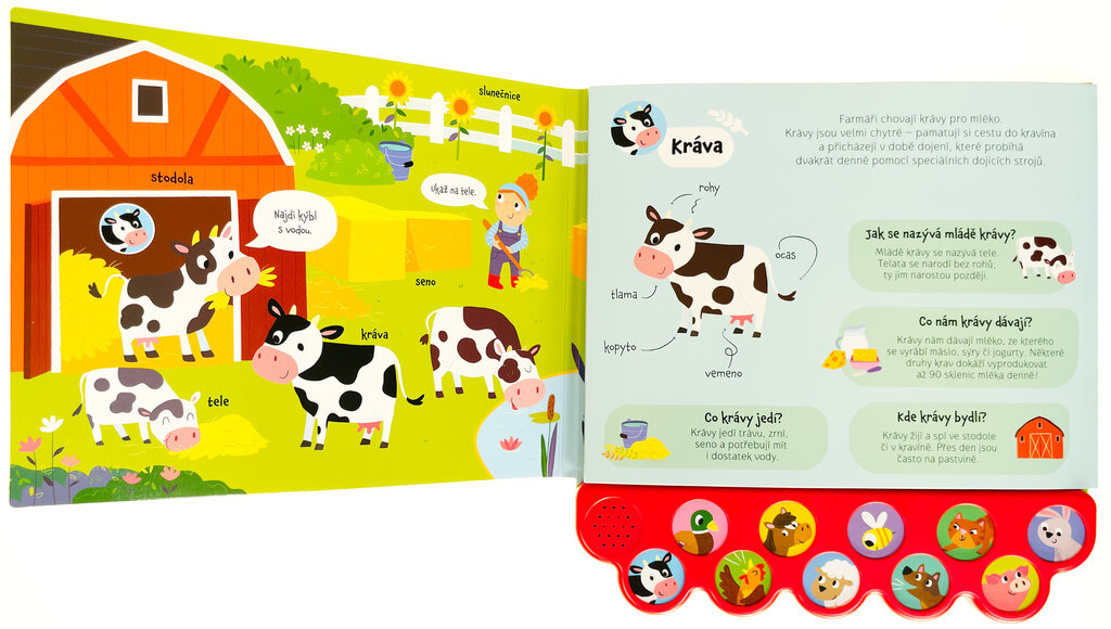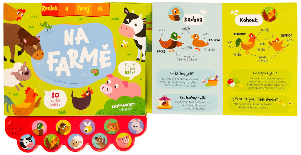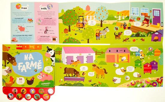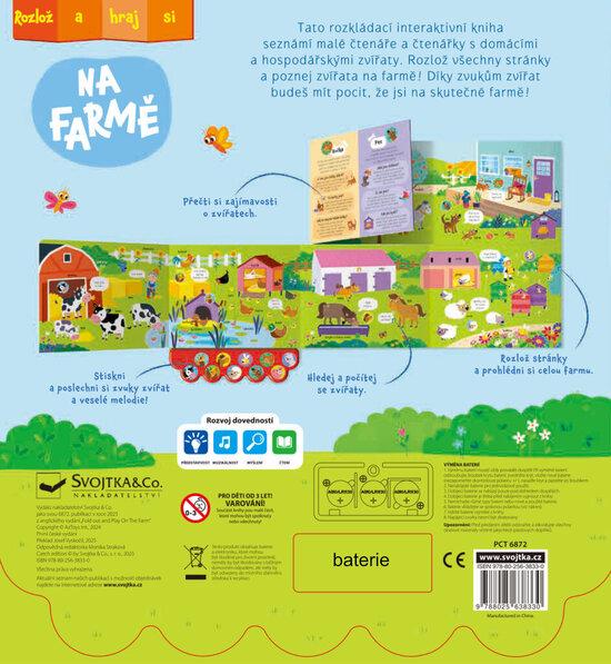 Rozložte stránky a objevujte kouzlo farmy v této interaktivní knížce plné zábavy a poznání! Toto zvukové rozkládací leporelo přináší malým čtenářům fascinující svět domácích a hospodářských zvířat. Poznejte koně, krávy, prasata, včely a další obyvatele farmy, poslouchejte autentické zvuky zvířat a seznamte se s jejich zajímavými vlastnostmi a se životem na statku. Stiskněte tlačítko a zaposlouchejte se do zvuků zvířat i veselých melodií. Rozvíjejte jemnou motoriku při hledání a počítání zvířátek nebo objevujte příběhy z farmy díky bohatým ilustracím a aktivitám na každé stránce. Rozkládací knížka navíc podporuje představivost, myšlení a muzikální cítění – ideální knižní dárek pro zvídavé děti od 3 let.