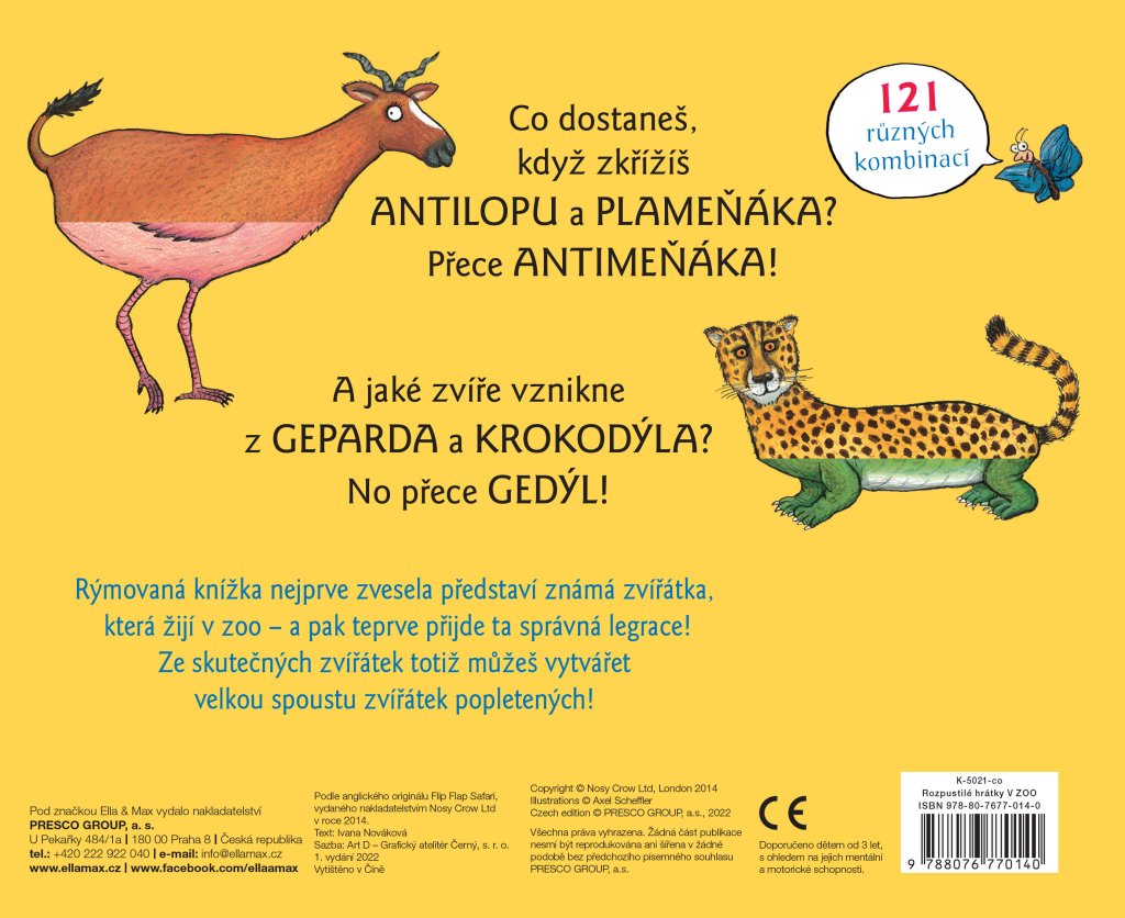 Nejprve se seznamte se zvířátky – a pak z nich poskládejte nějaká úplně nová, legrační! Rýmovaná knížka nejprve představí zvířátka, která žijí v zoologických zahradách – a pak teprve přijde ta správná legrace! Ze skutečných zvířátek totiž můžete vytvářet velkou spoustu zvířátek popletených! ...