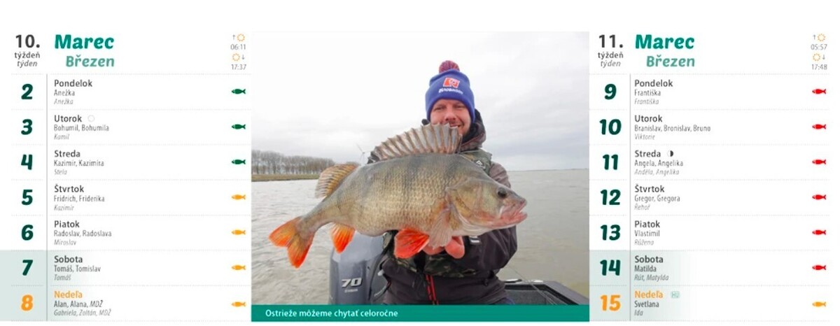 Praktický rybársky stolový kalendár s aktivitou rýb na celý rok, so zákonnými lovnými mierami najbežnejších rýb a časom ich individuálnej ochrany. Obsahuje aj prehľad celoročne chránených rýb a denný čas lovu rýb podľa typov vôd. 28 reálnych fotografií úlovkov z rôznych revírov. Slovensko-české kalendárium s menami, štátnymi sviatkami, východmi a západnmi Slnka a fázami Mesiaca.