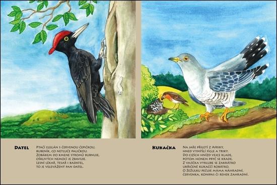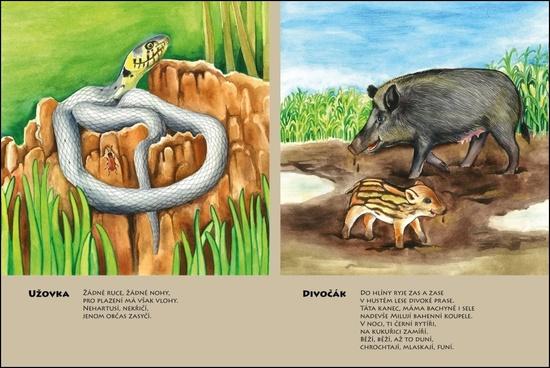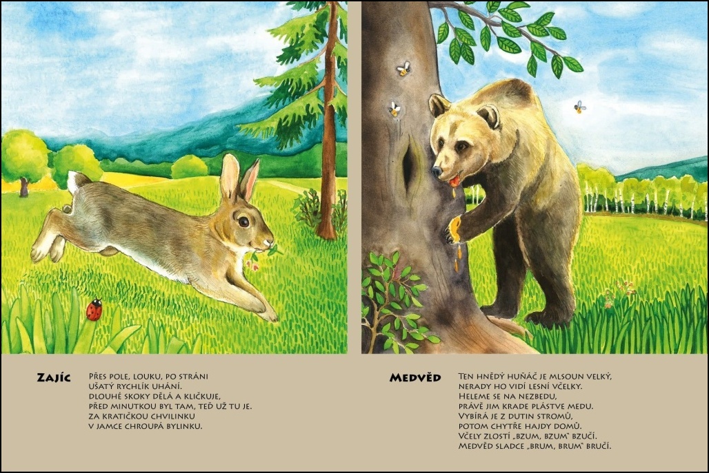 Leporelo obsahuje říkanky se 14 zvířátky z lesa.