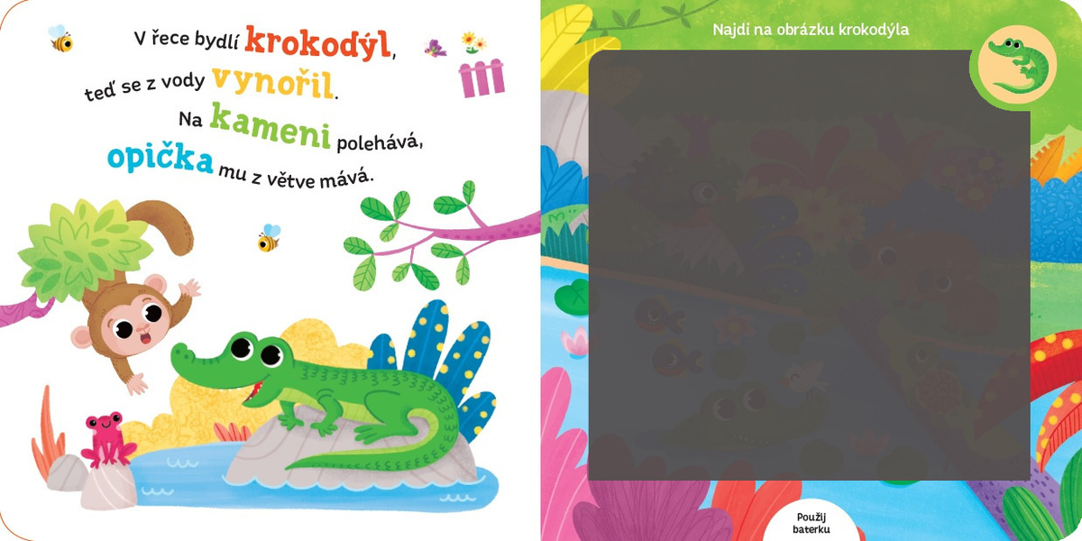 Kniha s veselými říkankami a papírovou baterkou, pomocí které děti hledají na stránkách schovaná zvířátka, představuje báječný způsob, jak děti při čtení zaujmout. Stačí vložit baterku mezi stránku a černou fólii, která ji překrývá, a zvířátka ukrytá v kresbě se zviditelní. Baterka má své místo v otvoru na první stránce a ke knize je připevněna barevnou stuhou, což zamezí jejímu ztracení. Barevně zvýrazněná vybraná slova v říkankách mohou posloužit k učení poznávaní barev.