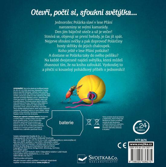 Jednorožec Polárka slaví v lese Přání narozeniny se svými kamarády. Den jim báječně uteče a už je večer! Stmívá se, objevují se první hvězdy, je čas jít spát. Nejprve sfoukni svíčky a pak doprovoď Polárčiny hosty skřítky do jejich chaloupek. Koho ještě v lese Přání potkáte? A dostane se Polárka taky do svého pelíšku? Na každé dvojstraně najdeš světýlka, která můžeš zhasnout tím, že na knihu zafoukáš. Vyzkoušej to a přečti si kouzelný pohádkový příběh o jednorožci!