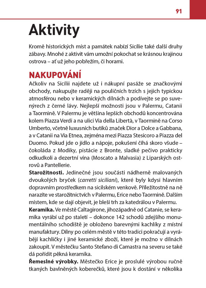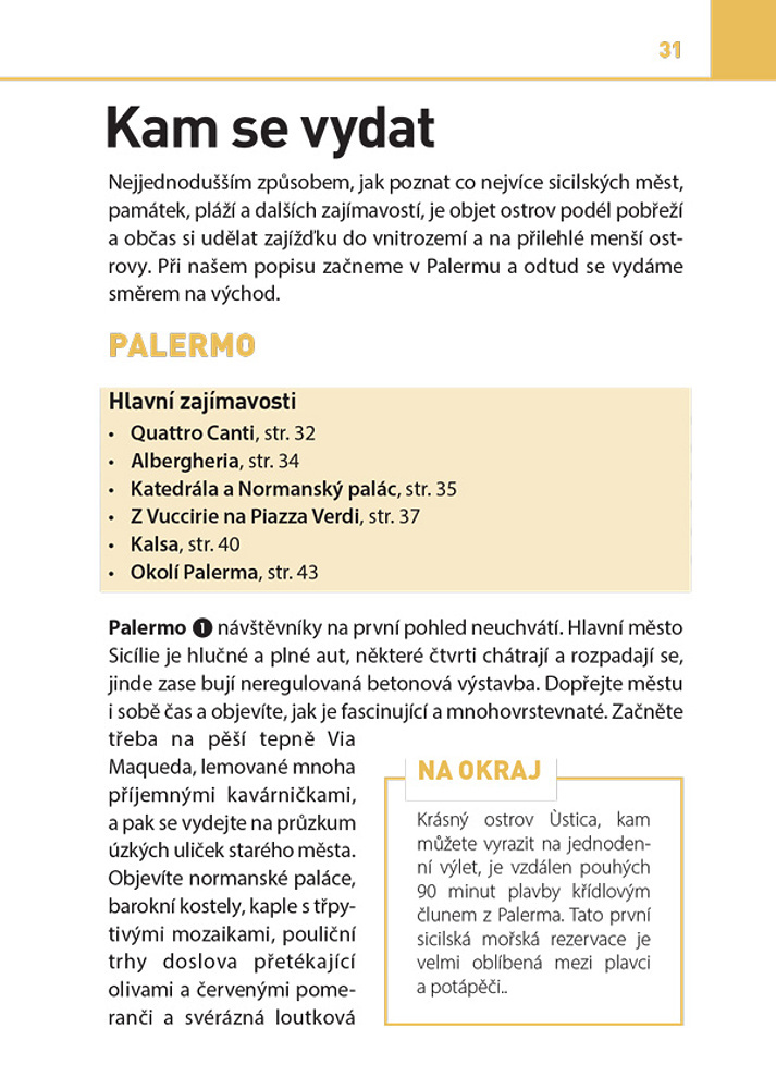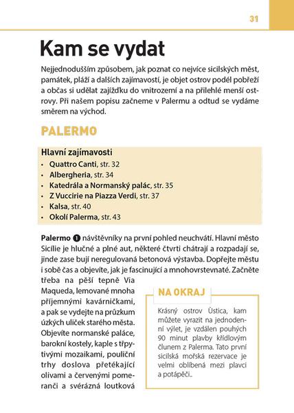 Nechte se inspirovat bezpočtem krásných míst, která přímo vybízejí k návštěvě. V úvodu knihy najdete tři itineráře: první vás během osmi dní provede celou Sicílií. Druhý itinerář vás seznámí s místními gastronomickými specialitami a se třetím objevíte přírodní bohatství ostrova.