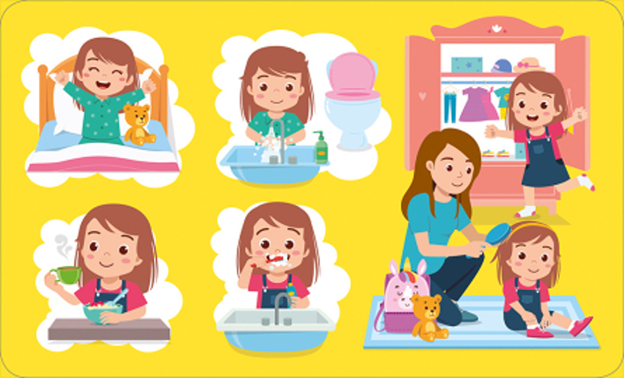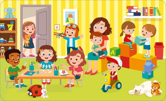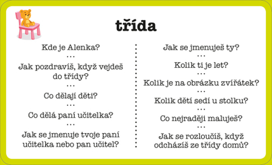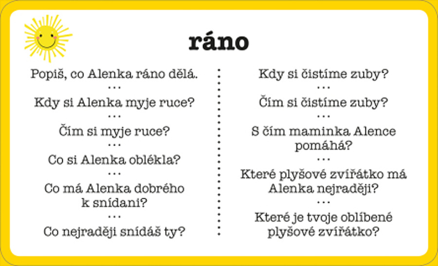 Alenka má 4 roky a chodí do školky. Nejlépe je jí doma s maminkou a tatínkem, ale i ve školce je zábava. Ve školce se učí nové věci a hraje si se svými kamarády. Prohlédni si obrázky a řekni, co všechno ve školce dělá. Dokážeš odpovědět na otázky na druhé straně karet?