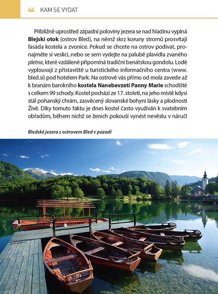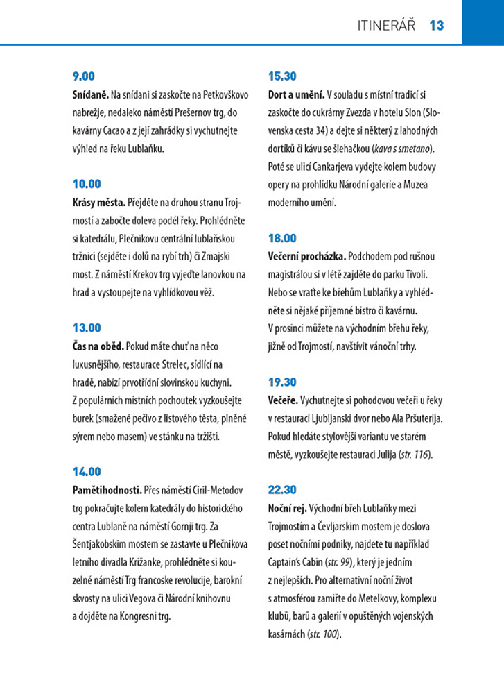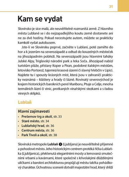 Nechte se inspirovat bezpočtem půvabných míst, která přímo vybízejí k návštěvě. V úvodu knihy najdete tři itineráře: první nabízí plán na ideální den v Lublani, druhý potěší zejména milovníky pěší turistiky a třetí vás provede jihozápadní částí země.