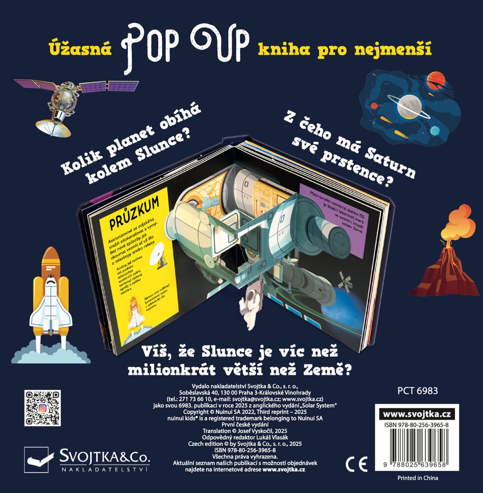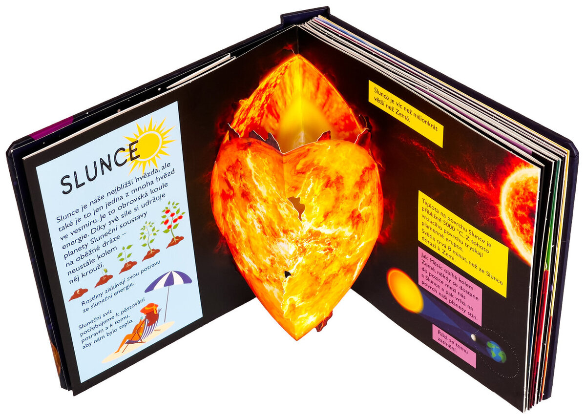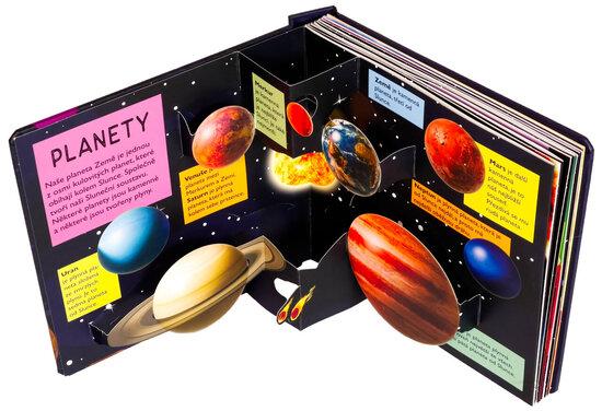 Kolik planet obíhá kolem Slunce? Z čeho má Saturn své prstence? Víš, že Slunce je víc než milionkrát větší než Země? Vstup do této krásně ilustrované knihy se spoustou prostorových pop-up obrázků a najdeš na tyto otázky odpovědi a dozvíš se i mnoho dalšího! Kniha je určena pro nejmenší děti, které se díky ní seznámí s naší Sluneční soustavou, planetami, Sluncem, Měsícem i s průzkumem vesmíru a poznají zázračnou planetu Zemi. Pro malé děti jsou pop-up obrázky ideální, protože do nich mohou doslova vstoupit a vše si lépe a názorně představit. Toto interaktivní a hravé zpracování ve vašich dětech jistě vzbudí zájem a udrží pozornost na dlouhé hodiny.