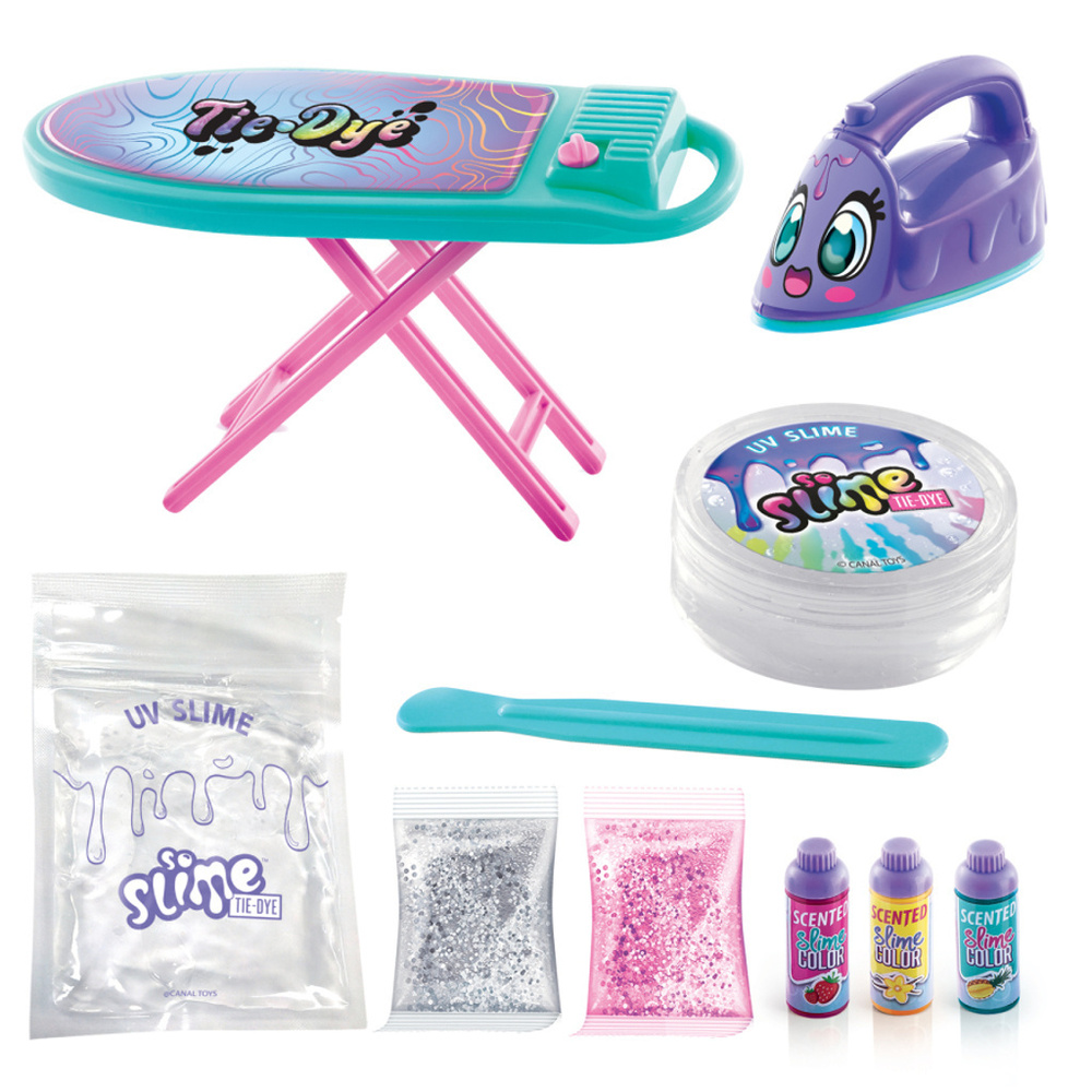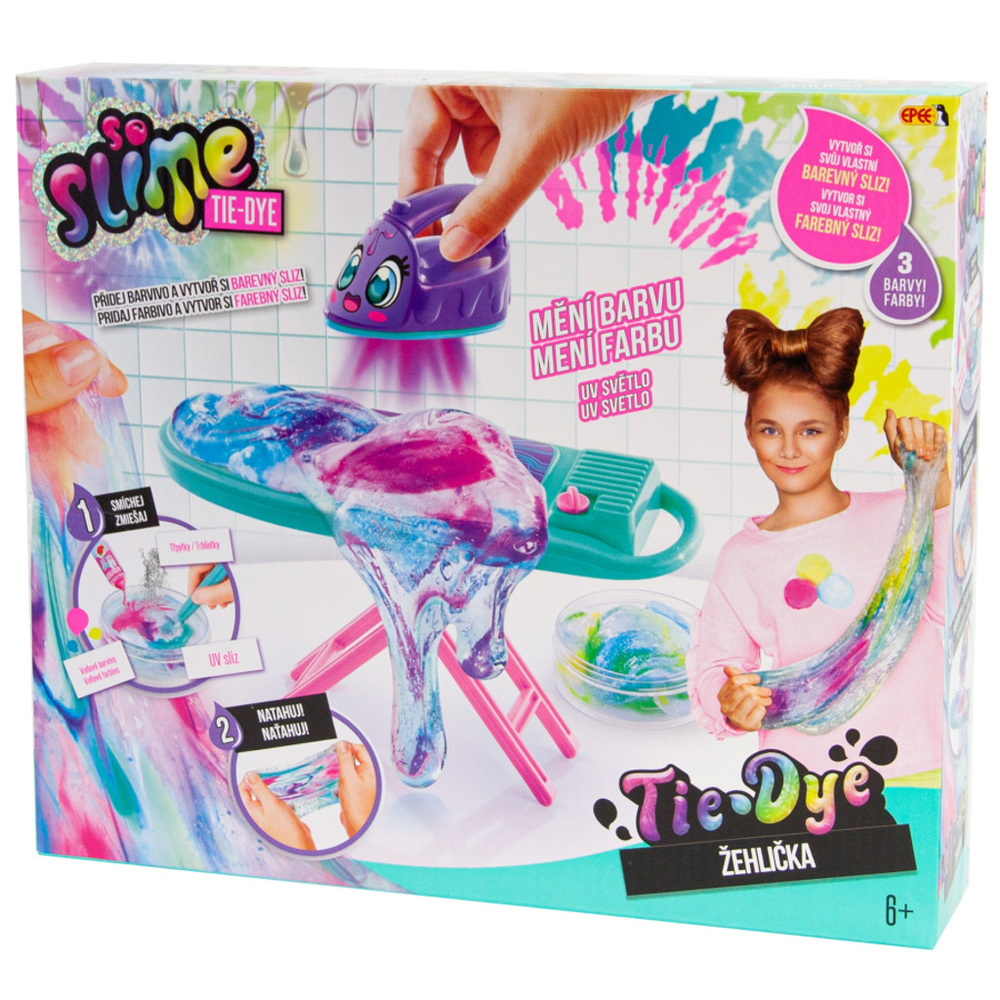 Toto je úplně nová řada slizů So Slime. Zapojte svoji fantazii a vytvořte si úžasně slizkou prádelnu. Vytvořte si jedinečný duhový sliz. Zamíchejte do bezbarvého slizu barvy, kombinujte je a můžete použít i třpytky. Použijte žehličku s UV světlem a sledujte, jak duhový sliz změní svoji barvy. Věk: 6 +.
