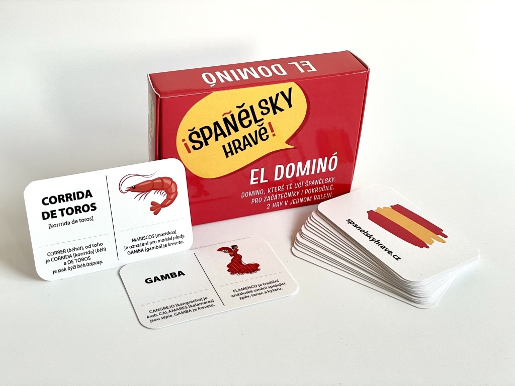 Vyzkoušejte unikátní vzdělávací domino Španělsky Hravě a naučte se při hraní španělsky efektivně a s úsměvem. Domino pobaví i vzdělá celou rodinu, je vhodné pro základní i jazykové školy, mladé i starší hráče. Díky dominu tak procvičíte důležité fráze, časy, gramatické jevy jako časování sloves, číslovky, zájmena, rozdíly mezi SER a ESTAR, rozkazy či subjuntiv.