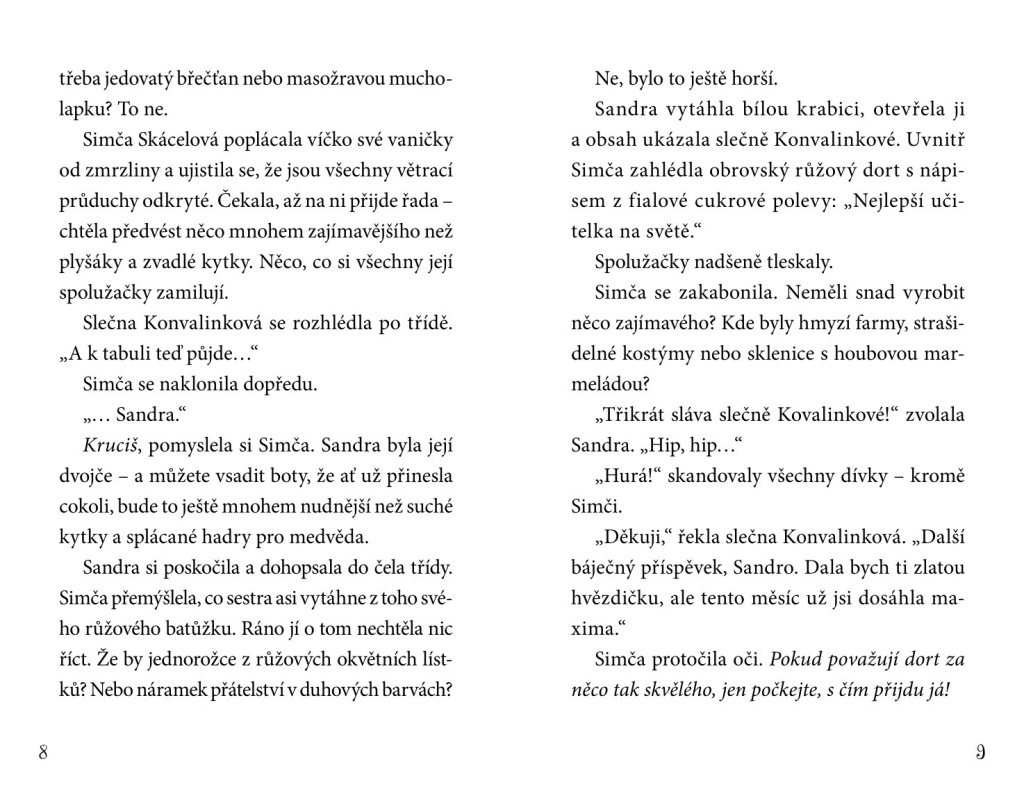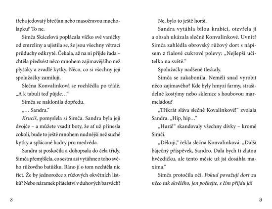 Simča nikdy nezapadala mezi slušně vychované dámy navštěvující školu Jarověž. Když jí během hodiny přírodopisu uteče její krysí mazlíček Quentin, je to poslední kapka. K radosti učitelů, spolužáků i svého dokonalého dvojčete Sandry je přeložena na Kazidřevo. Školu, jejíž motto zní „Učením ke ...