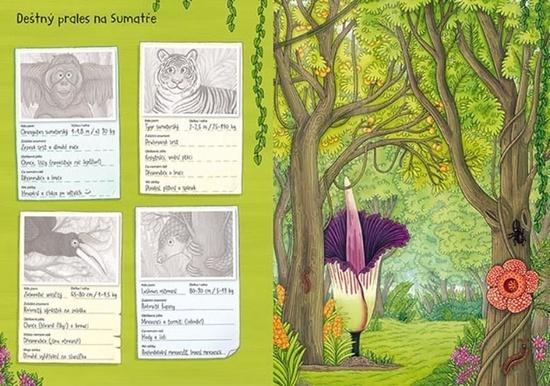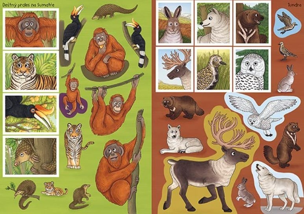Samolepková knížka obsahuje 24 barevných stran plných různých druhů zvířat a 8 stran samolepek k dolepení.