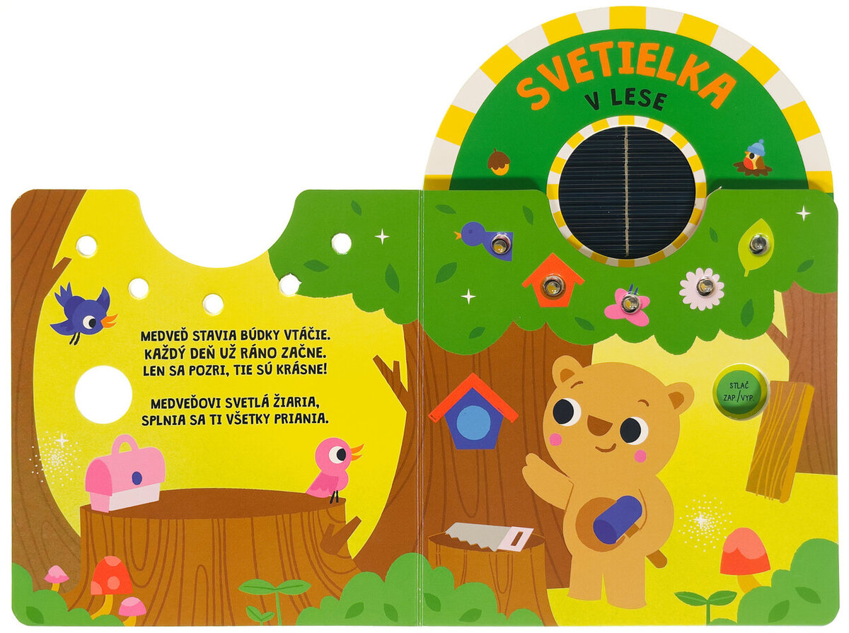 Medvedík, veverička, jazvec aj králik sa hrajú v lese plnom radosti. Ich príbehy sprevádzajú LED svetielka, ktoré vytvárajú svietiace reťaze, girlandy a dekorácie pôsobiace kúzelne a upokojujúco. Teplé jemne blikajúce svetlo nebodá do očí, navodzuje príjemnú atmosféru a knižku robí ideálnou voľbou na čítanie pred spaním. Vďaka napájaniu solárnou energiou nie sú potrebné batérie - stačí ju cez deň "nabiť" na slnku a večer stlačiť tlačidlo. Veršované texty a milé ilustrácie podporia predstavivosť aj radosť zo spoločného čítania.