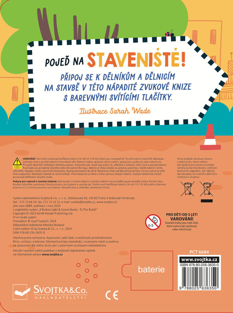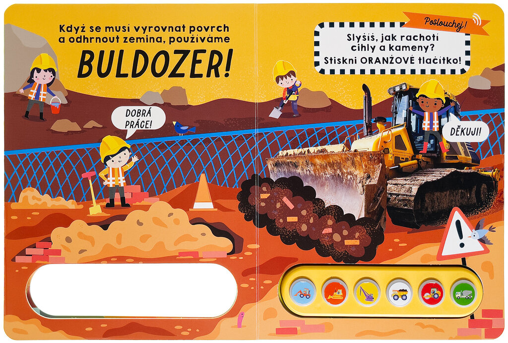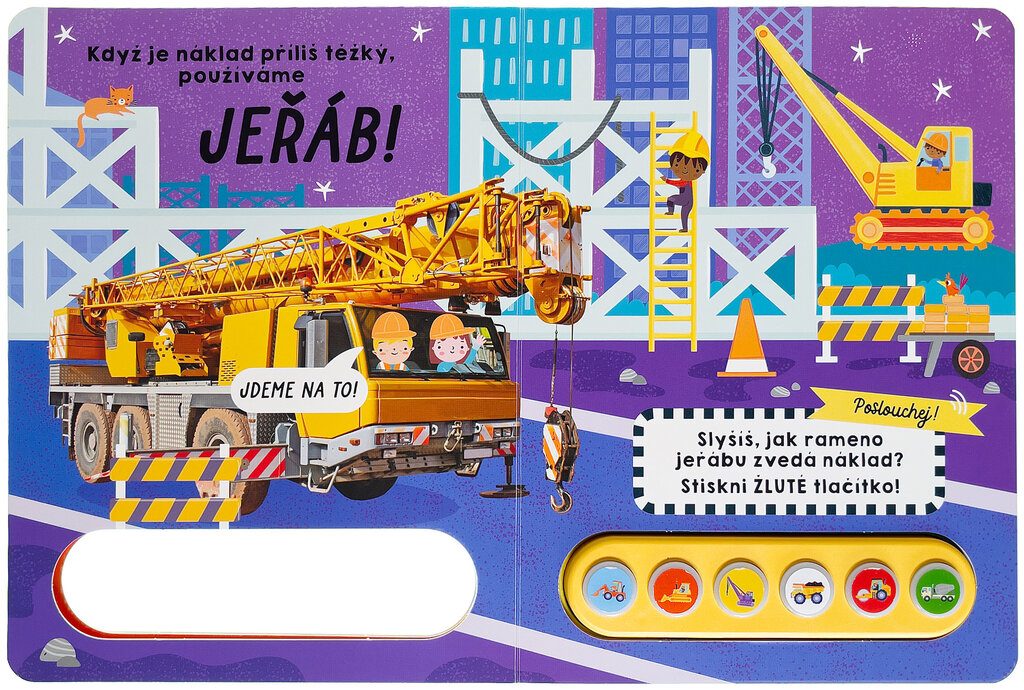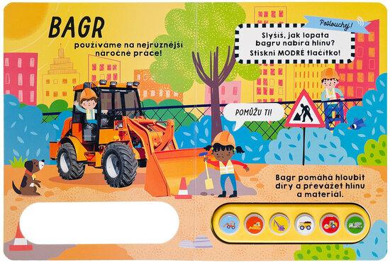 Poznej práci na stavbě! Stiskni barevné svítící tlačítko a poslechni si zvuk bagru, ramene jeřábu nebo silniční válec. Tato kreativně ilustrovaná zvuková kniha s fotografiemi stavebních strojů seznámí děti s prací na staveništi.
