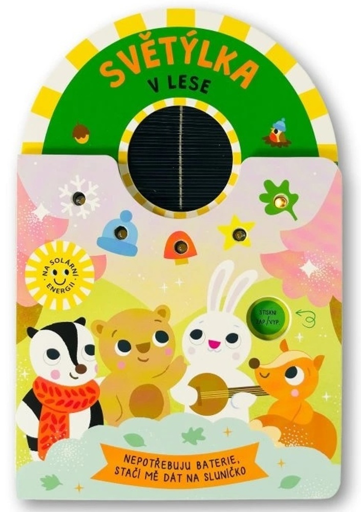 Medvídek, veverka, jezevec i králík si hrají v lese plném radosti - a jejich příběhy doprovází světýlka, která jemně rozzáří stránky. LED žárovičky nad obrázky vytvářejí svítící řetězy, girlandy a dekorace, které působí kouzelně a uklidňujícím dojmem. Světlo je teplé, nebodá do očí a pomalu, příjemně problikává, takže se knížka skvěle hodí i jako večerní rituál před spaním. Díky napájení solární energií není potřeba žádná baterie - stačí knížku během dne "nabít" na sluníčku a pak stisknout tlačítko. Veršované texty a milé ilustrace podpoří představivost i radost ze společného čtení.