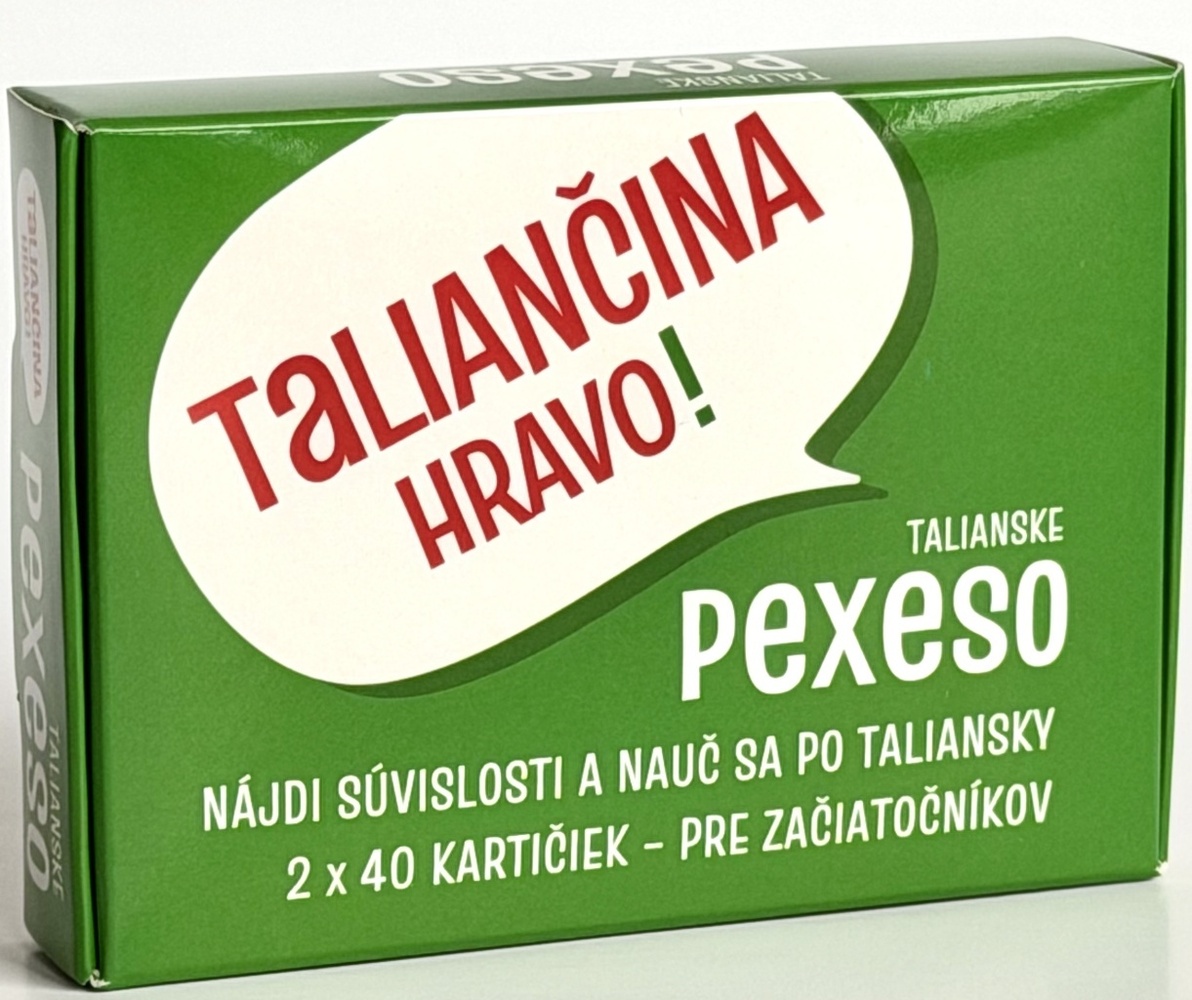 Talianske pexeso Taliančina Hravo Vás hravým spôsobom učí taliansky jazyk a precvičuje Vašu pamäť. V tomto pexese neotáčate a nehľadáte rovnaké obrázky, ale hľadáte súvislosti v taliančine. Niekedy ide o doplnenie do talianskej vety, inokedy o zodpovedanie otázky či dokonca o hádanku. 80 hracích kariet rozdelených na dve sady pexesa precvičí nielen Vašu pamäť, ale aj taliančinu. Karty sú dokonale prepojené a obsahujú aj vysvetlenia talianskej gramatiky.