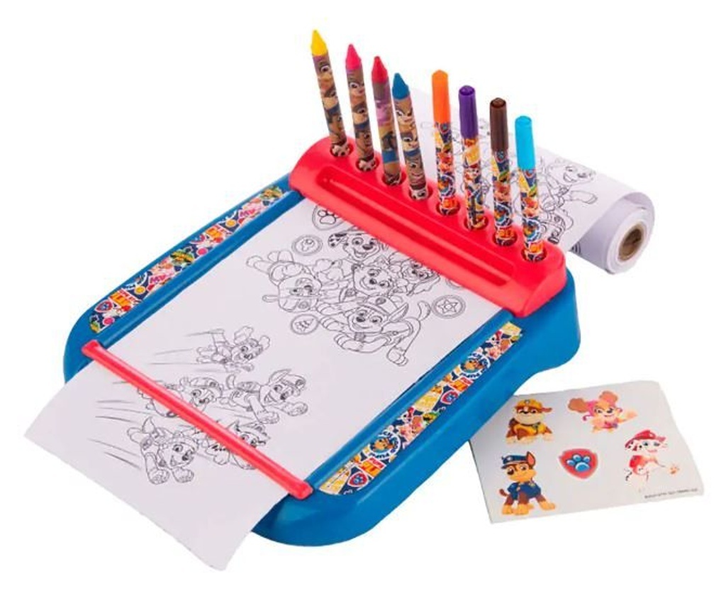 Praktický stojan s rolí plnou omalovánek Tlapkové Patroly. Obsahuje 4 fixy a 4 voskovky.