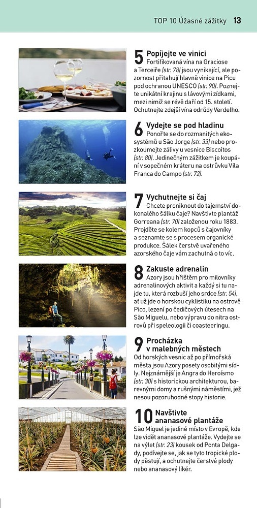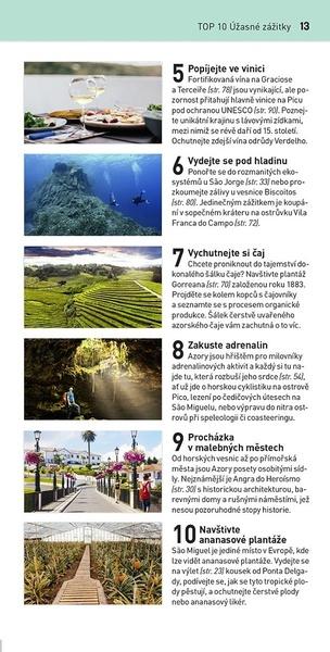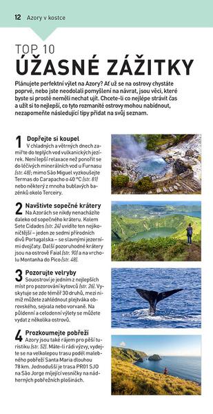Průvodce Top 10 poskytuje přehled nejatraktivnějších lokalit na Azorách. Kapitoly jsou řazeny tematicky i po jednotlivých ostrovech a každá obsahuje 10 nejlepších tipů a krásné fotografie, které zprostředkují atmosféru místa. Inspirujte se a zamiřte k termálním pramenům, vystupte na horu Pico, projděte se po hlavním městě Ponta Delgada, anebo se vydejte na adrenalinový výlet s potápěním, canyoningem či surfováním.
