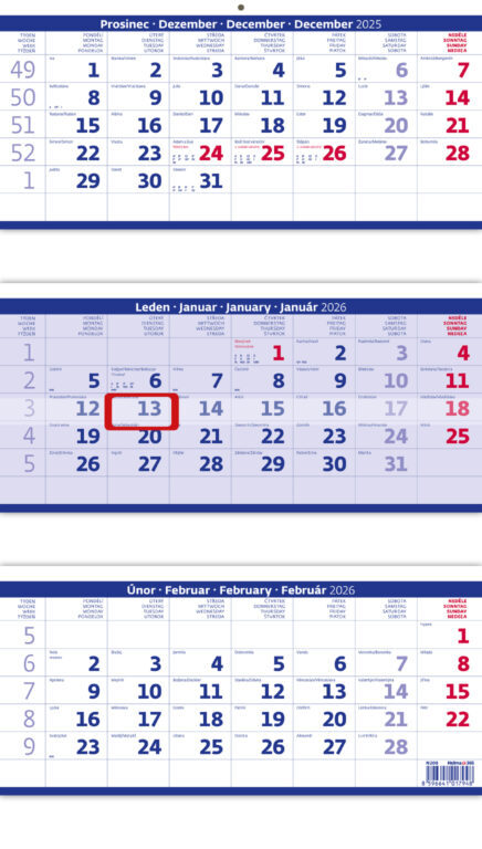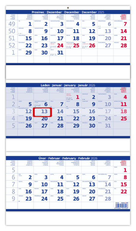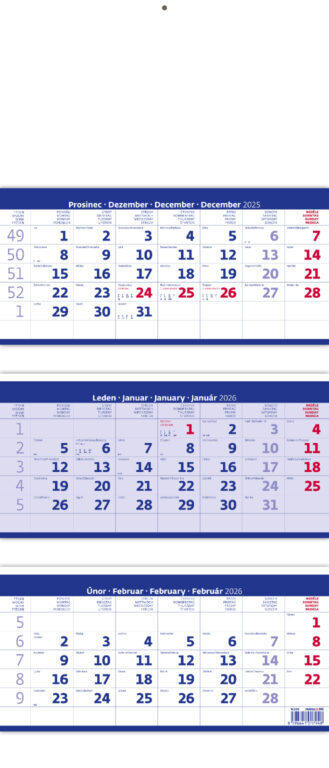 Formát kalendáře: 31,5 x 55,5 cm </br> Kalendárium: české tříměsíční jmenné + svátky vybraných evropských států (CZ / SK / A / B / D / F / H / CH / I / PL / RUS / UKR) </br> Rozsah kalendáře: 3 x 12 listů </br> Prostor pro přítisk: 31,5 x 3,5 cm </br> Složený kalendář: 31,5 x 18,5 cm </br> Vejde se do obálky B4 </br> Součástí celého balení je 20 kusů laší zdarma