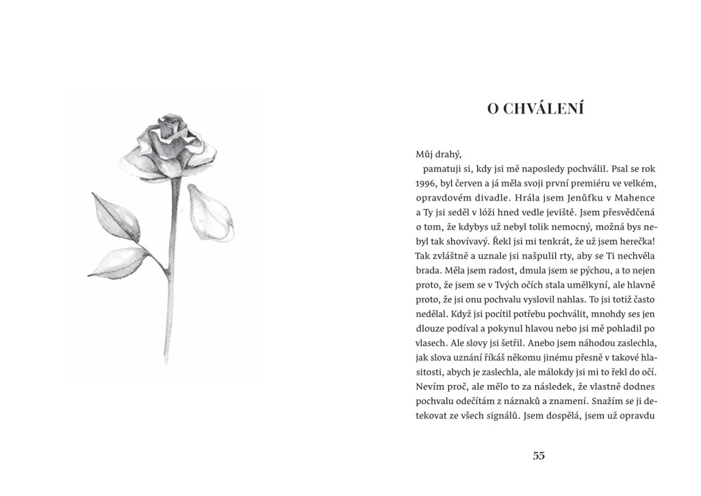Občas je potřeba se zastavit. Zachytit úsměv, myšlenku, absurditu, vzpomínku, postřeh, slzu. A prohlédnout si je, potěšit se s nimi. Někomu ji poslat, dát přečíst. I když dopisních schránek ubývá a let přibývá. Úsměvné, něžné, spiklenecké příhody a úvahy ze života ženy, která je sice herečka z Národního divadla a seriálů, ale taky manželka, milenka, matka, dcera, sestra, kamarádka, sousedka, řidička, učitelka, hrdá Moravanka a majitelka jednoho těla…