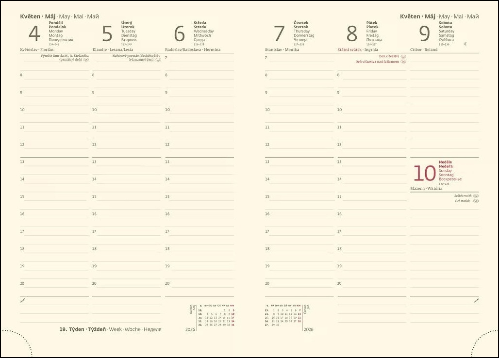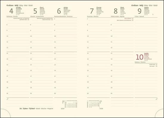 Formát diáře: 145 x 205 mm </br> Rozsah diáře: 128 stran </br> Kalendárium: týdenní </br> + poutko na tužku </br> + papír bloku chamois
