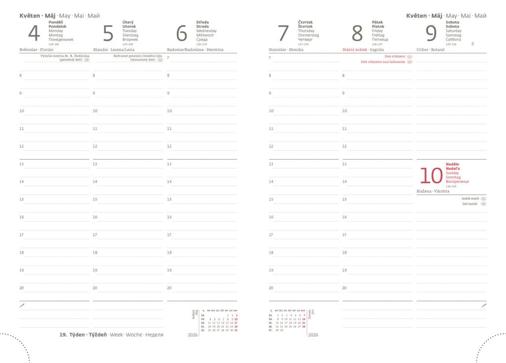 Formát diáře: 145 x 205 mm </br> Rozsah diáře: 128 stran </br> Kalendárium: týdenní