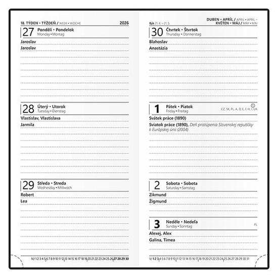 Kapesní týdenní diář do každé kapsy je vyráběný z matného hladkého lamina s parciálním lakem, který dodává každému diáři šmrnc.