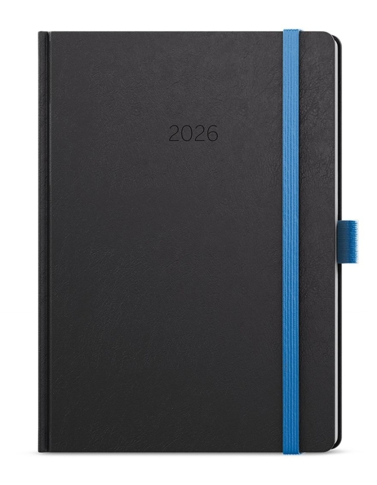 Neobyčejný týdenní diář s matným povrchem ze strukturovaného materiálu s modrou gumičkou a poutkem. Je vyráběný ve formátu A5, má velký prostor pro poznámky a plánování.