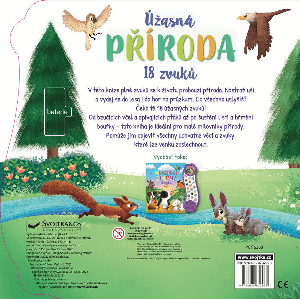 V této knize plné zvuků se k životu probouzí příroda. Nastražte uši a vydejte se spolu s dětmi do lesa i do hor na průzkum. Co všechno uslyšíte? Čeká vás 18 úžasných zvuků! Od bzučících včel a zpívajících ptáků až po šustění listí a hřmění bouřky - tato kniha je ideální pro malé milovníky přírody. Pomůže jim objevit všechny úchvatné věci a zvuky, které lze venku zaslechnout.