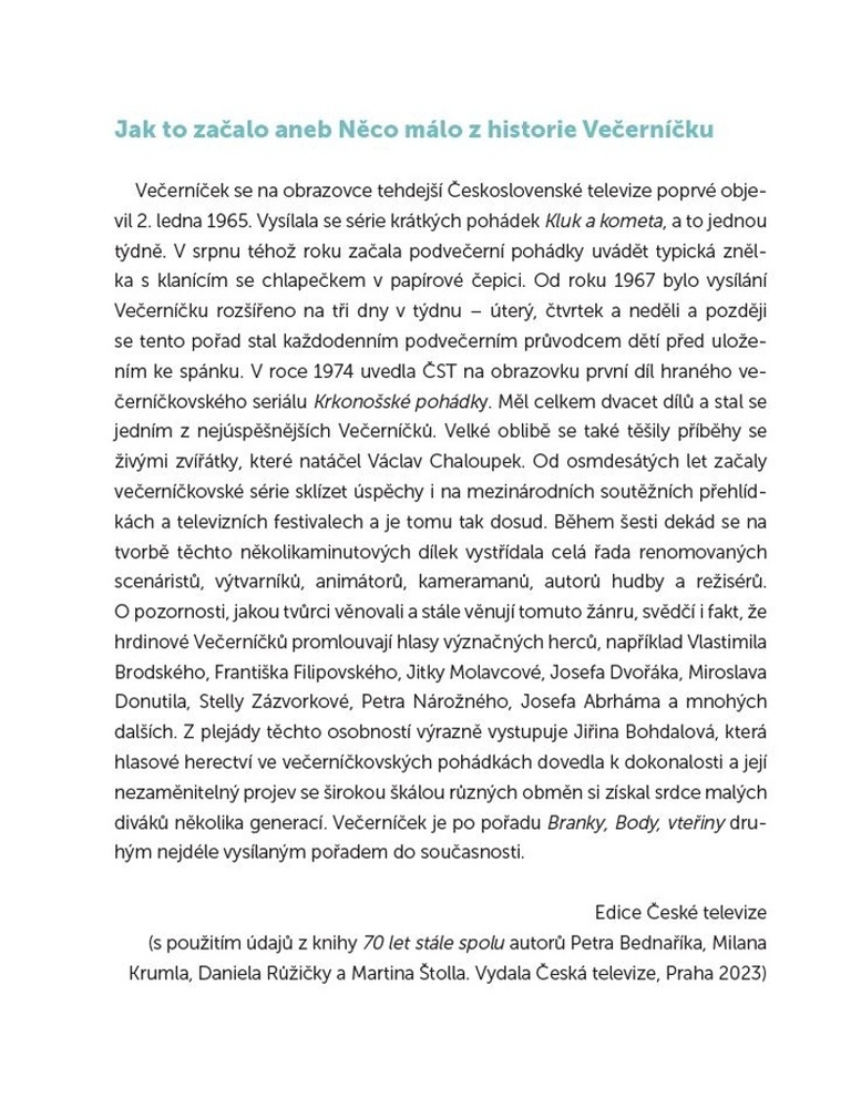 Pohádky před spaním patří ve vysílání České televize už po mnoho generací k těm nejoblíbenějším. Malým připomenutím tohoto ojedinělého fenomému a hlavně nestárnoucí postavičky, kterou před šedesáti lety vymyslel výtvarník Radek Pilař a jíž vdechl život režisér Václav Bedřich, je i tento sborník s vybranými Večerníčky z produkce ČT. Obrázkové příběhy, věrně reprodukující ty televizní, si mohou s rodiči či prarodiči prohlížet ti nejmenší. Literární ukázky z knih vydaných v Edici České televize jsou určeny k souvislejšímu předčítání nebo pro zdatnější čtenáře.