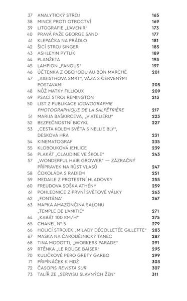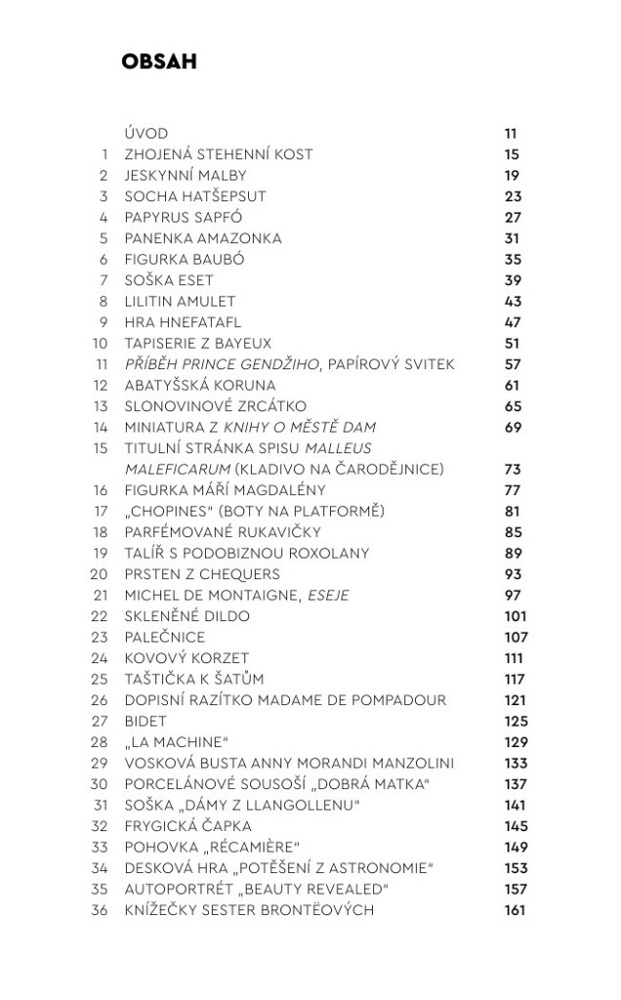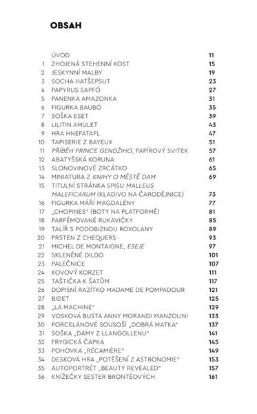 Annabelle Hirsch vypráví dějiny prostřednictvím věcí, které patřily nebo byly určeny ženám. Stovka předmětů zde zastupuje normy a mýty, ale také symbolizuje ženskou emancipaci. Dočteme se o kuriózních objektech, například o skleněném dildu ze šestnáctého století nebo kovovém korzetu, ale i o zcela všedních věcech, jako je psací stroj nebo bicykl. Tyto předměty vyprávějí o osudech neznámých žen, umělkyň, intelektuálek i současných celebrit, od kurtizán a otrokyní přes Hannu Arendt až po Kim Kardashian. Krátké příběhy jednotlivých věcí vrhají nové světlo na roli žen v dějinách a dokazují, že ženy nikdy nestály stranou historie, pouze jim nebyla věnována pozornost.