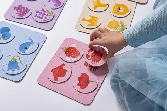 Sada 24 velkých kulatých žetonů a šesti hracích desek z pevného kvalitního kartonu, ideálního pro malé dětské ručičky.