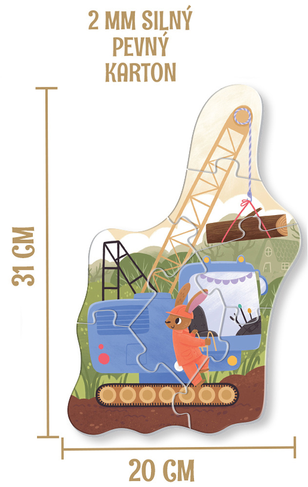 Puzzle zobrazuje 5 různých stavebních strojů, které jsou složeny z různého počtu dílků - od jednoduchých dvoudílných po velké sedmidílné puzzle, které má rozměry 31 x 20 cm!