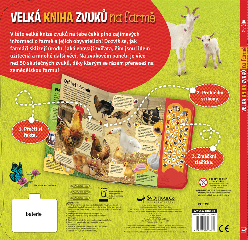 Na farmě je opravdu živo. Chovají tam mnoho zvířat a pořád se něco děje. V této knize najdete mnoho zajímavostí o farmě a jejích obyvatelích! Dozvíte se, jak farmáři sklízejí úrodu, chovají zvířata, čím jsou jednotlivá zvířata lidem užitečná a mnohé další věci. Čtení a prohlížení si můžete zpestřit více než padesáti opravdovými zvuky. Na každé stránce najdete plno fotografií ze života na farmě. U jednotlivých výjevů jsou obrázkové ikony a zajímavá fakta, a pokud na zvukovém panelu najdete stejný obrázek a zmáčknete jej, rázem se ocitnete uprostřed hlučné farmy. Pobavte se s touto velkou knihou zvuků a naučte se o životě farmě něco nového! Kniha obsahuje tři výměnné baterie. Prodejní cena zvukové knihy již obsahuje recyklační poplatky.