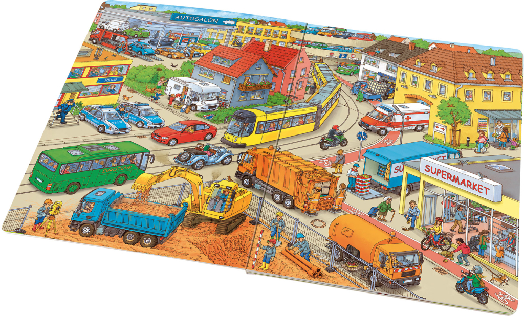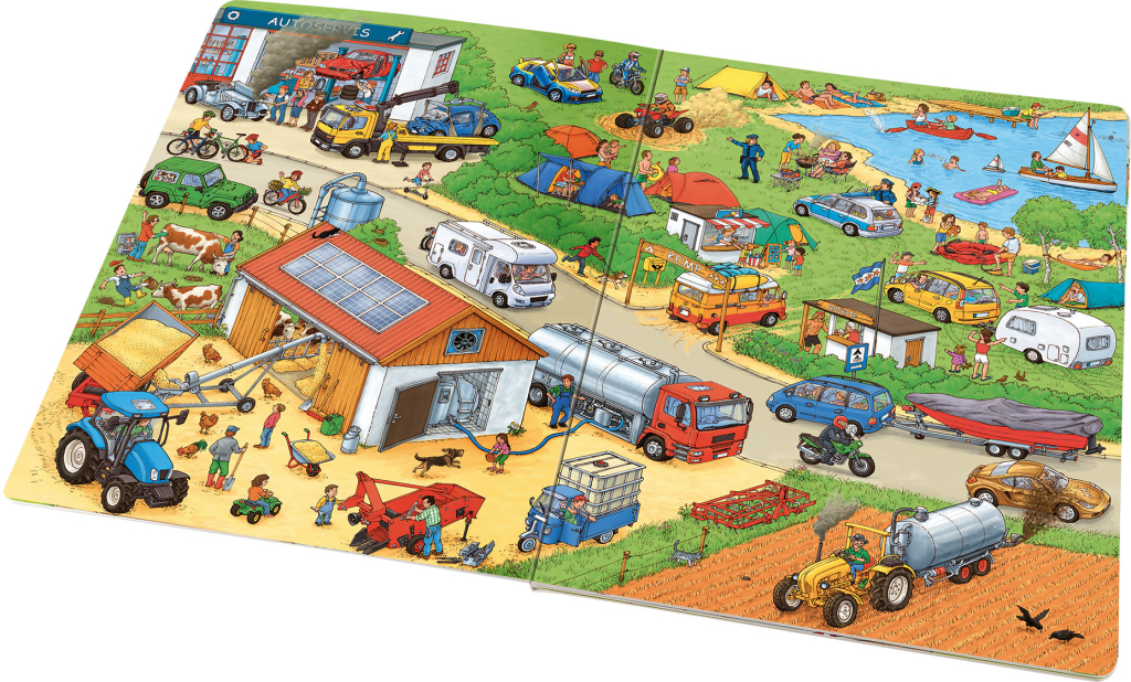 Na silnicích, na stavbách, na závodní dráze… tam všude jsou k vidění nejrůznější druhy aut a jiných vozidel. Tahle krásná knížka je jich plná! Bohatě propracované ilustrace s množstvím detailů přitahují dětskou pozornost a podněcují představivost a fantazii. Malí vypravěči mohou popisovat, co vidí na obrázcích, hledat v nich a kreativně rozplétat a opět spojovat nekonečné nitky možných příběhů. Díky tomu budou rozvíjet svou slovní zásobu i základy předčtenářských dovedností. Stačí se jen ponořit do barevného světa obrázků a pozorně se dívat…
