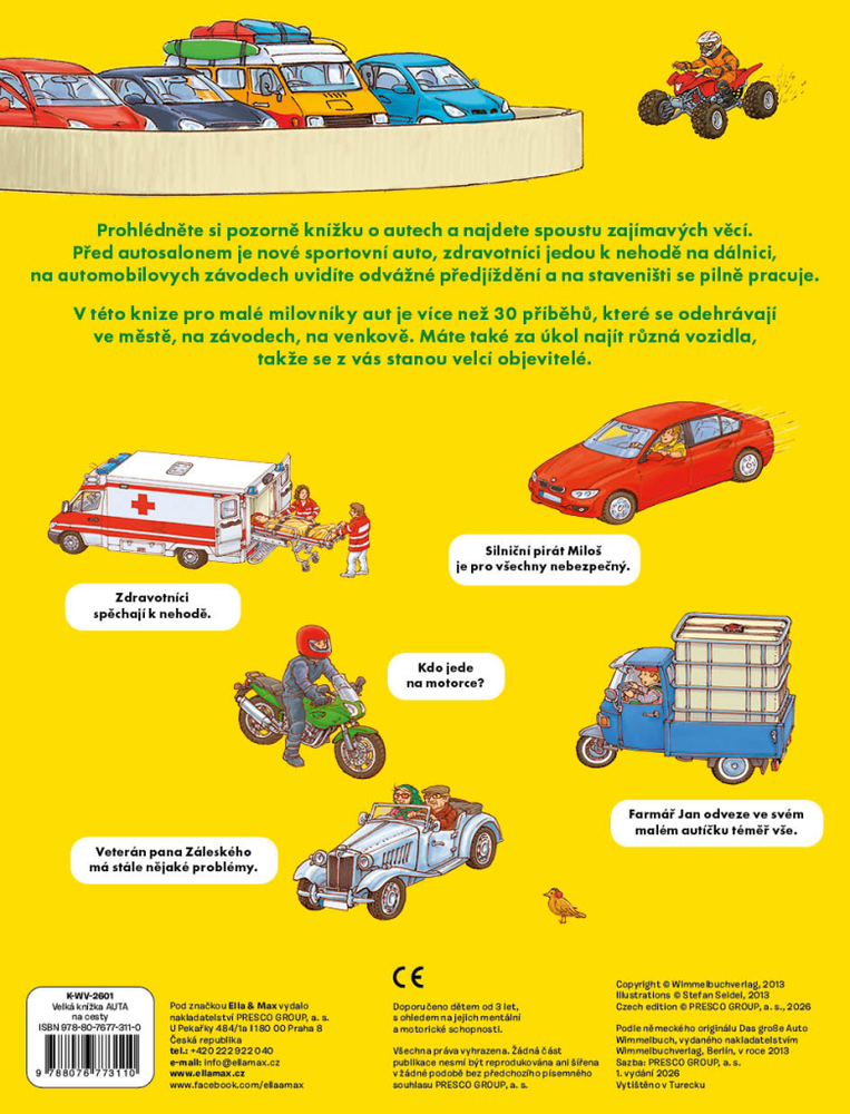 Na silnicích, na stavbách, na závodní dráze… tam všude jsou k vidění nejrůznější druhy aut a jiných vozidel. Tahle krásná knížka je jich plná! Bohatě propracované ilustrace s množstvím detailů přitahují dětskou pozornost a podněcují představivost a fantazii. Malí vypravěči mohou popisovat, co vidí ...