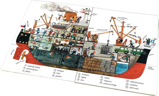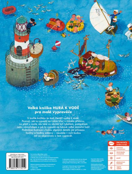 S touhle krásnou barevnou knížkou se malí čtenáři vydají k vodě. Poznají, jak to vypadá na rybím trhu, v rušném přístavu, na pláži u moře, ale také co obnáší být rybářem, potápěčem nebo námořníkem, a dokonce pirátem! A jak to vypadá uvnitř takové velké námořní lodi? Podrobné ilustrace s řadou vtipných detailů přinášejí dětem hodiny a hodiny zábavy – neustále v nich totiž mají co objevovat a o čem vyprávět. Díky tomu rozvíjejí nejen svou představivost a fantazii, ale také slovní zásobu a základy předčtenářských dovedností.