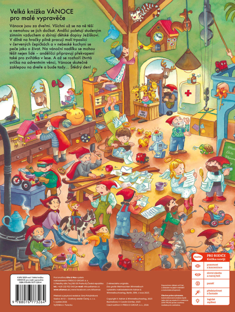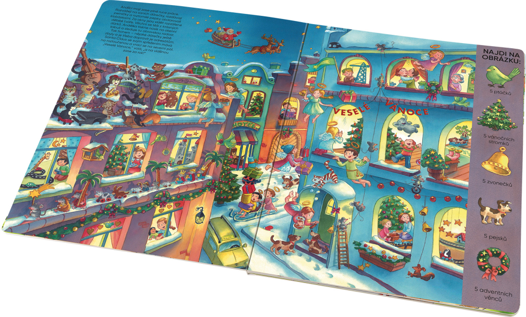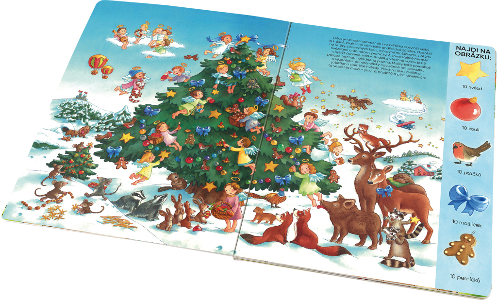 Vánoce jsou za dveřmi. Všichni už se na ně těší a nemohou se jich dočkat. Andílci poletují studeným zimním vzduchem a sbírají dětské dopisy Ježíškovi. V dílně na hračky pilně pracují malí trpaslíci v červených čepičkách a v nebeské kuchyni se peče jako o život. Na vánoční nadílku se mohou těšit nejen lidé – připravuje se i překvapení pro zvířátka v lese! S touhle knížkou můžete být u toho. Prohlížejte, zkoumejte a vypravujte. Na každé dvoustraně vás navíc čeká výzva: budete na obrázku hledat předměty podle zadání. Hezkou zábavu!