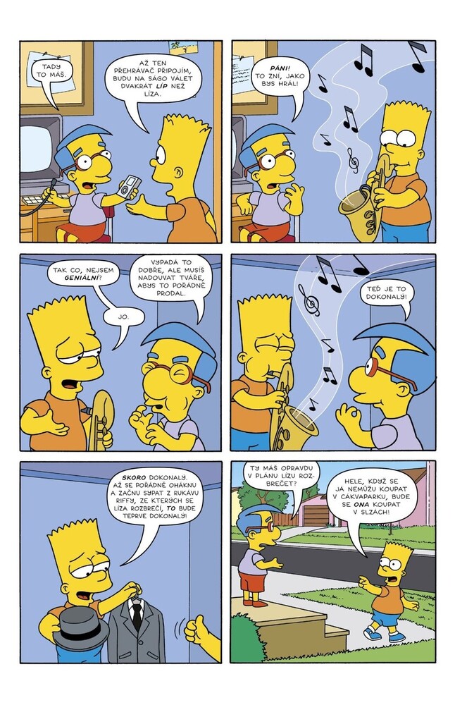 Připojte se k Bartu Simpsonovi a jeho kamarádům, kteří se utkají o titul třídního klauna, přelstí robotického školníka propadlého amoku, zasurfují si na sociální síti i v obrovské kaluži bláta, naučí se hrát blues, získají zpět elán a mnoho, mnoho dalšího! Dokonce i v případě, že si nosíte oběd v krabičce, tahle knížka vám zaručí, že splníte a dokonce i překročíte doporučenou denní dávku smíchu.