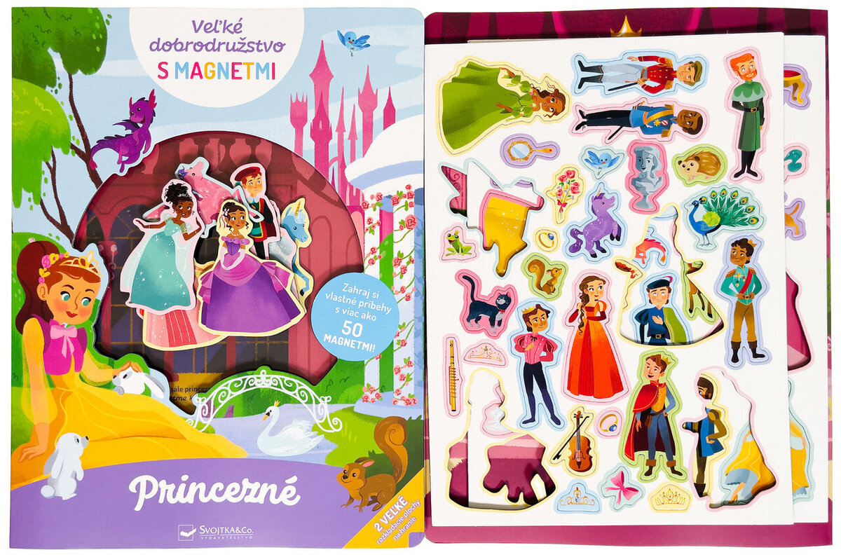 Vydaj sa do rozprávkového sveta princezien a princov s touto rozkladacou magnetickou knihou! Po rozložení meria 300 × 920 mm a obsahuje dve veľké scény na dopĺňanie viac ako 50 farebnými magnetmi. Vytvor si vlastné príbehy v zámockej záhrade plnej kúzelných bytostí alebo v tanečnej sále, kde sa koná ...
