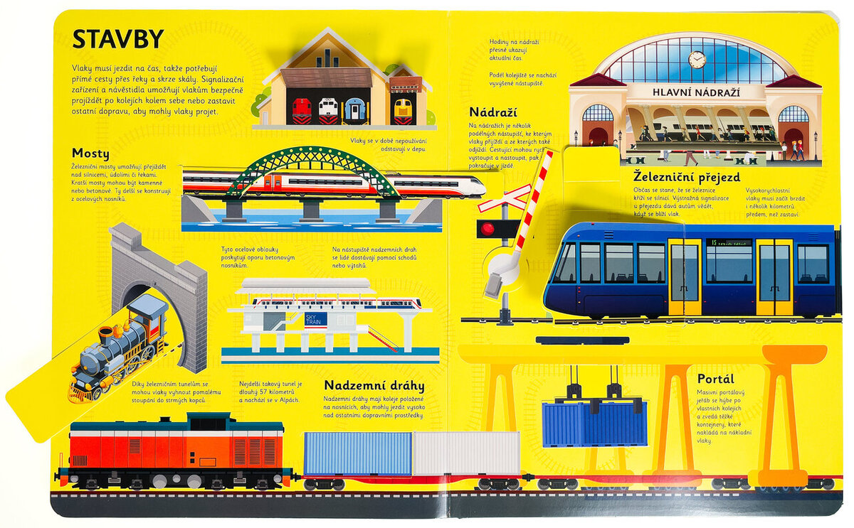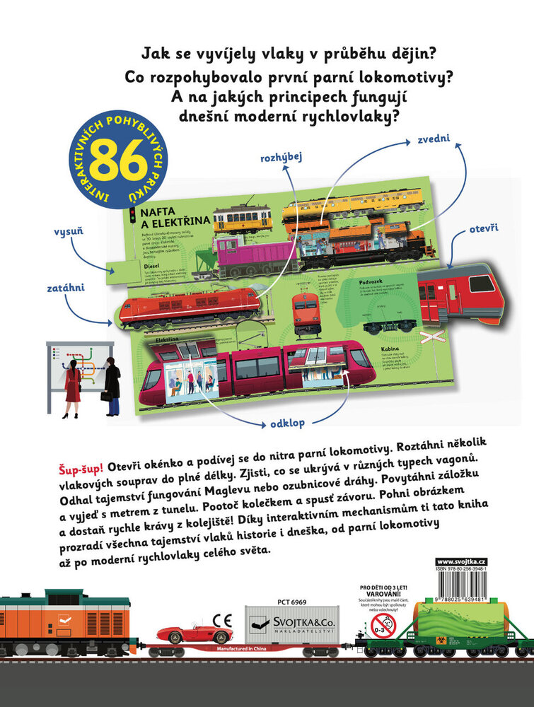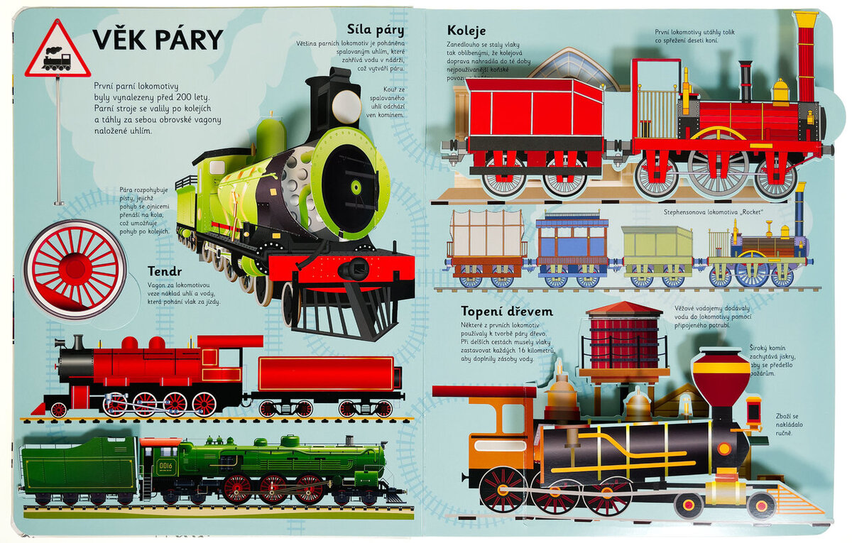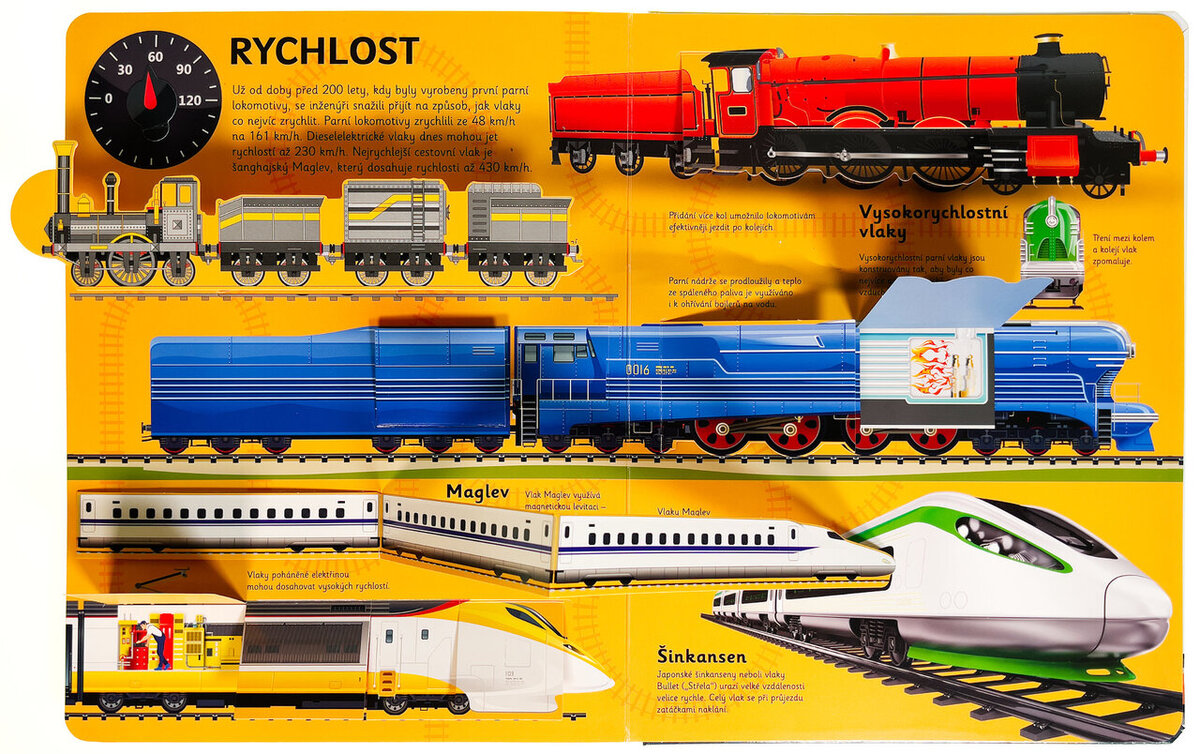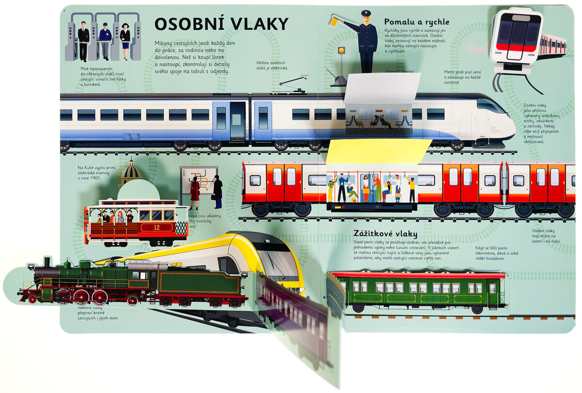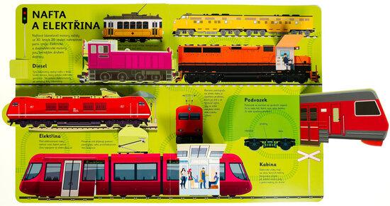 Prozkoumej fascinující svět vlaků díky této interaktivní knize plné pohyblivých prvků a okének! Objev, jak fungovaly parní lokomotivy nebo na jakém principu dnes jezdí moderní magnetické rychlovlaky. Zjisti, jak vlaky překonávají hory a řeky, jak vypadá podzemní metro nebo co všechno přepravují nákladní soupravy. V knize najdeš 86 pohyblivých mechanismů, díky nimž můžeš vlaky posouvat, rozkládat nebo nahlížet dovnitř vagónů. Vydej se na cestu historií i současností železnic - od dob parních strojů až po nejmodernější vlaky světa.