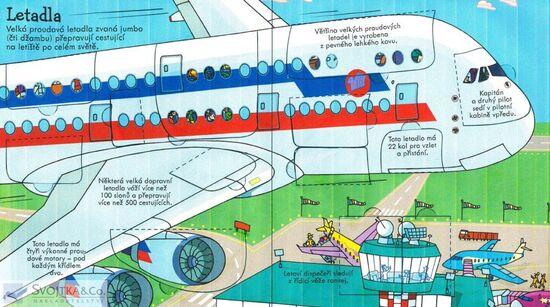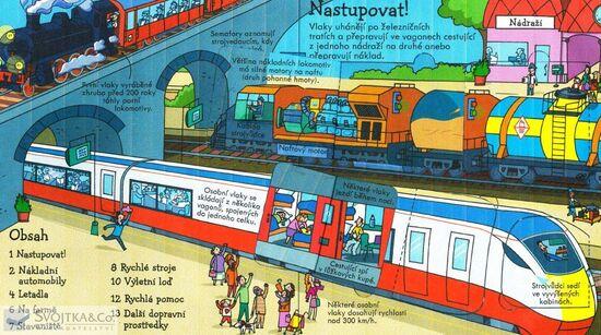 Seznam se díky této encyklopedické knížce, mající více než 60 odklápěcích okének, s různými dopravními prostředky – s vlaky, uhánějícími po železničních tratích, s nákladními automobily, převážejícími různé náklady, s velkými proudovými dopravními letadly, přepravujícími cestující po celém světě, ...