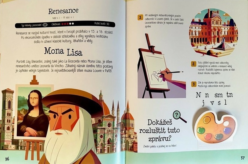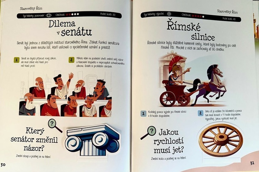 Tato napínavá publikace vás provede světem historie, a to ne jen tak ledajakou: v každé epoše se čtenář setká s nějakou záhadou, logickou hádankou, hlavolamem nebo postřehovou výzvou. Cílem je nejen pobavit, ale také umožnit dětem hravou a zážitkovou cestou objevovat minulost lidstva – od jeskynních kreseb, setkání se starými Řeky a Římany, prožívání výzev středověkého rytířství až po svět osvícenství, revolucí a moderní dobu.