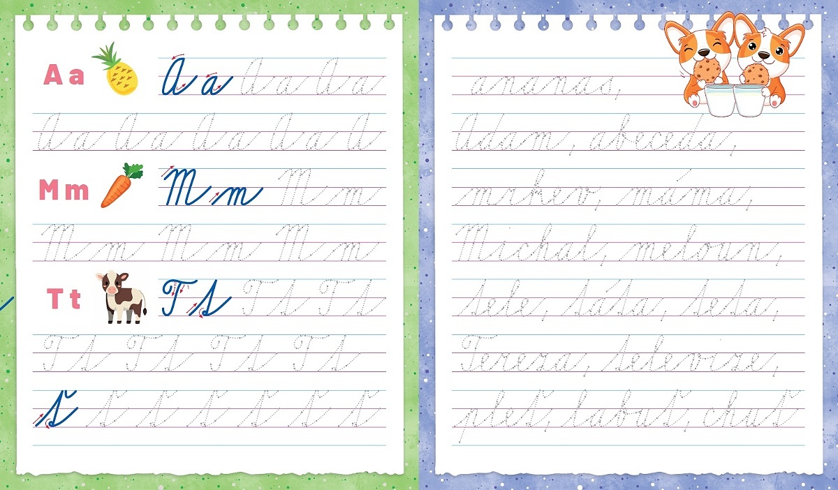 Písanka pro děti s předtištěným vzorem velkých a malých psacích písmen doplněná o psaní slov.