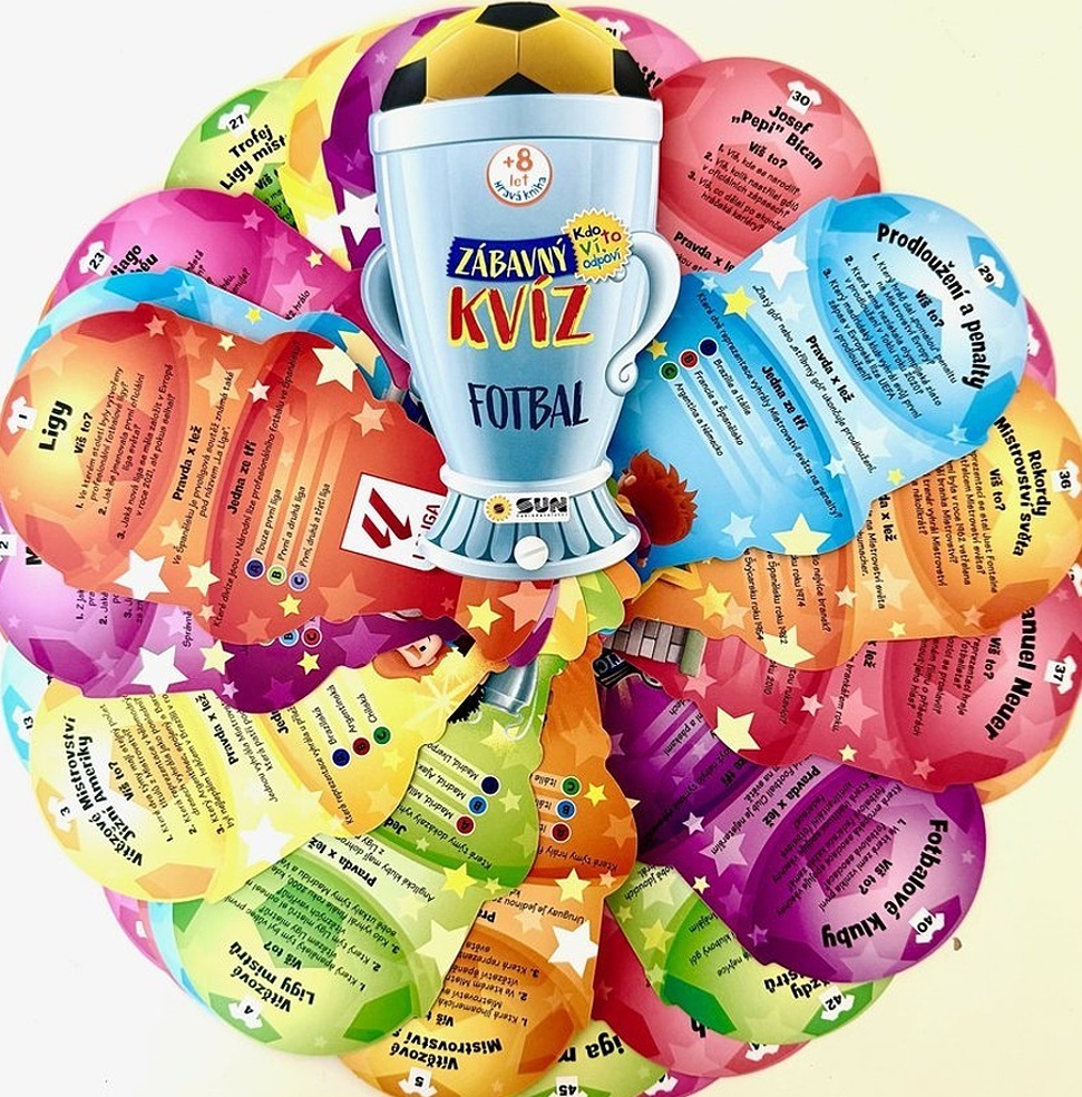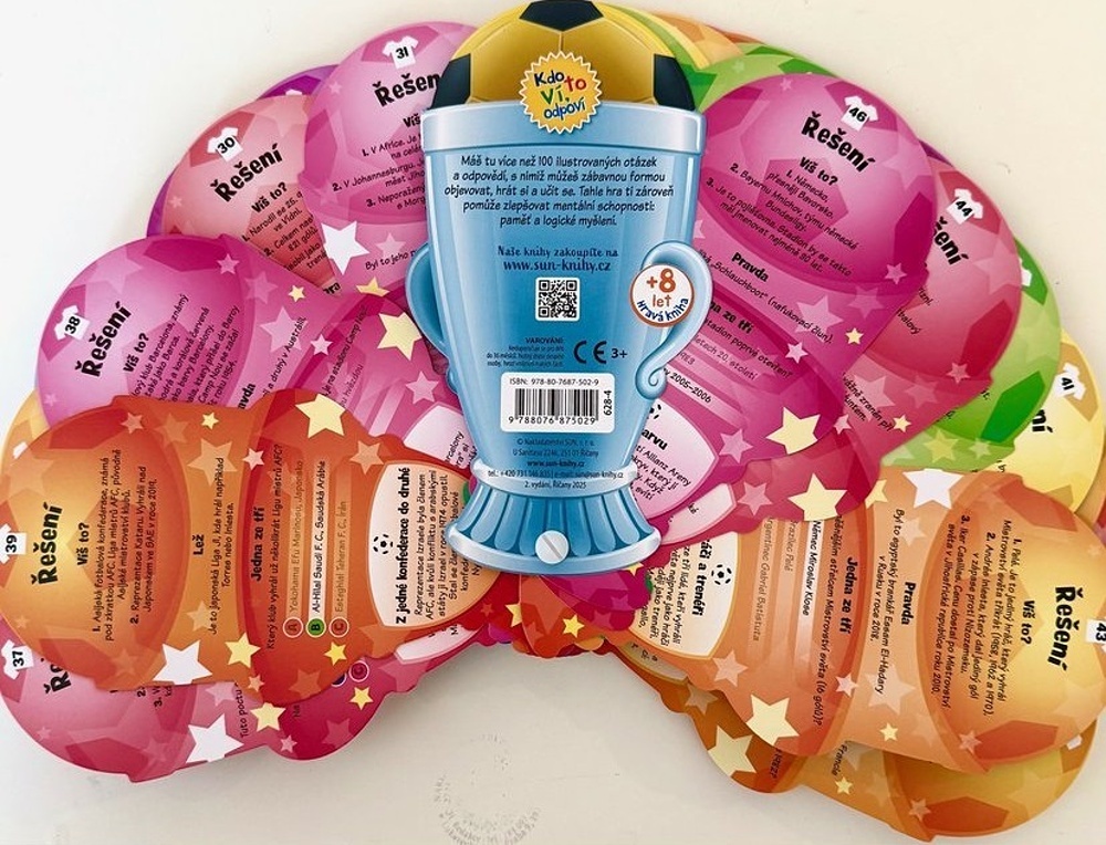 Fotbal, je vášní milionů lidí po celém světě již po celá desetiletí. Ať už kopeme do míče na hřišti jako amatéři, nebo sledujeme finále mistrovství svět, fotbal je vždy vzrušující a vytváří komunitu. Tento Zábavný kvíz Kdo to ví, odpoví – Fotbal - představuje svět fotbalu hravou, ale zároveň vzdělávací formou – od jeho historie až po největší turnaje, stadiony, legendární hráče a vzrušující rekordy. Kvíz obsahuje 46 oboustranných tematických karet, které obsahují otázky, zajímavé nebo doplňující informace, které vaše znalosti ještě více prohloubí – ať už se jedná o historický fakt, hvězdy, stadiony, rekordy nebo trofeje.