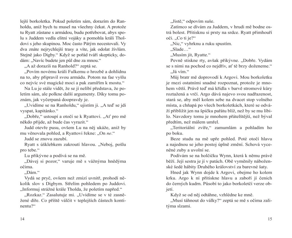 Jeden král uvěznil mé tělo, druhý mou mysl. Mezi Annwynem a Oreou zuří válka – nejen na bitevních polích, ale i v mém nitru. Nepřítel se mě snaží zlomit, zapomíná však na prastarou magii pouta páru. Slade a já se vždy najdeme, ve všech životech. Faeský král chce vymazat můj odkaz i vzpomínky, ale nepochopil jediné: zlato se ohne, kámen se zlomí. A zlatý kanárek? Nikdy nepadá. Létá.